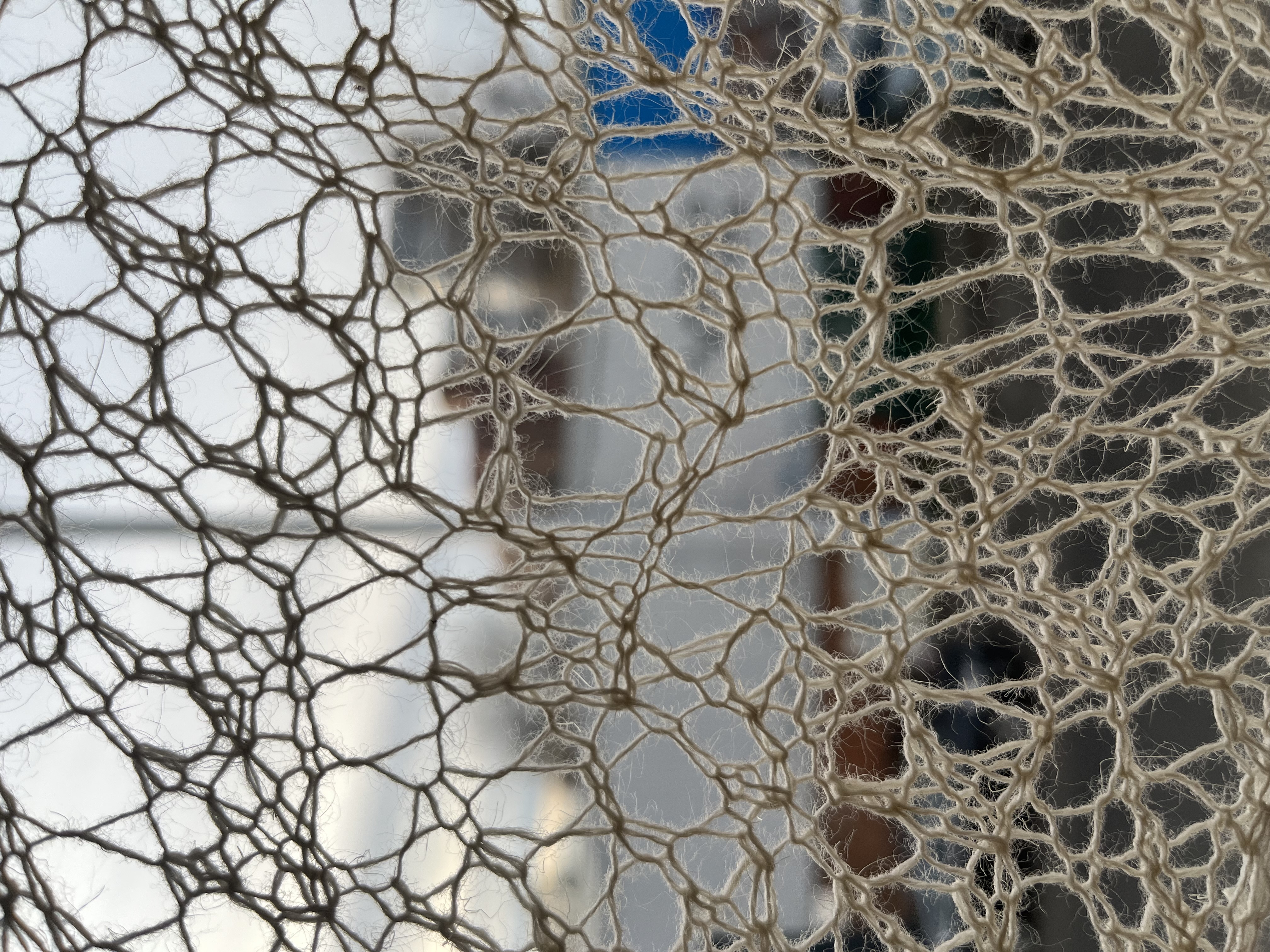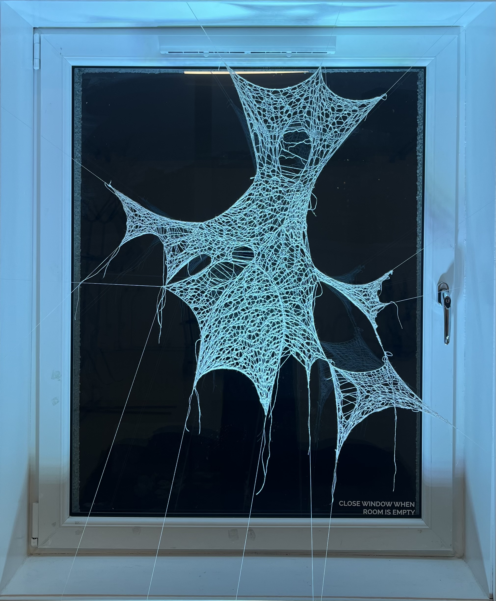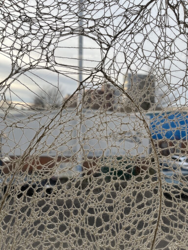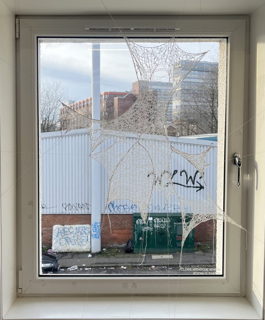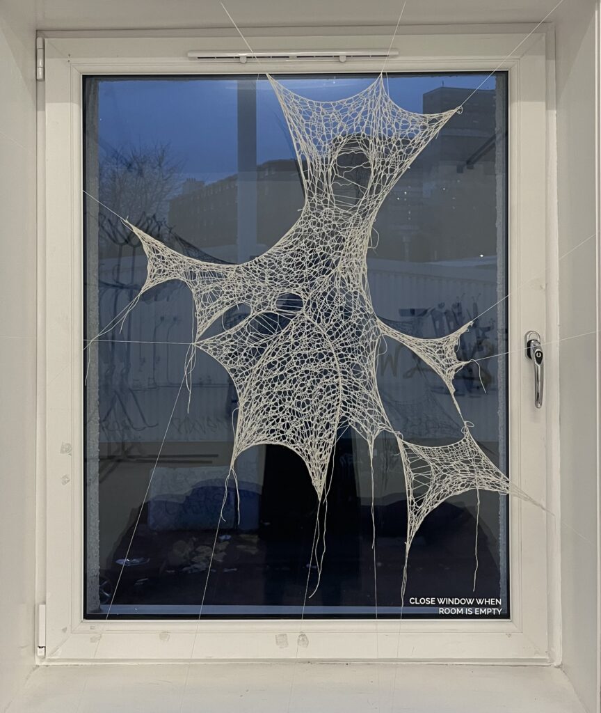 hand knitted english mesh lace, stretched and suspended within the window space. exhibited at Burns Street, Glasgow. 2025.